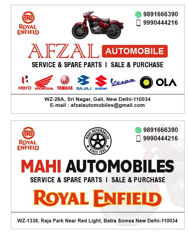 Afzal & Mahi Automobiles is a trusted name in vehicle service, spare parts, sales, and purchase, dedicated to delivering quality and customer satisfaction. With years of experience in the automobile industry, we provide reliable maintenance solutions for leading brands such as Royal Enfield, Hero, Honda, Yamaha, Bajaj, Suzuki, Vespa, and Ola. Our skilled technicians ensure every vehicle receives the utmost care, whether it is routine service, repairs, or part replacement. We also offer genuine spare parts and assist customers in buying or selling two-wheelers at fair prices. Conveniently located in New Delhi, both Afzal Automobile and Mahi Automobiles focus on transparency, affordability, and timely service. We believe in building long-term relationships with our customers by offering trustworthy guidance and efficient support. At Afzal & Mahi Automobiles, your vehicle’s performance and safety are our top priority.